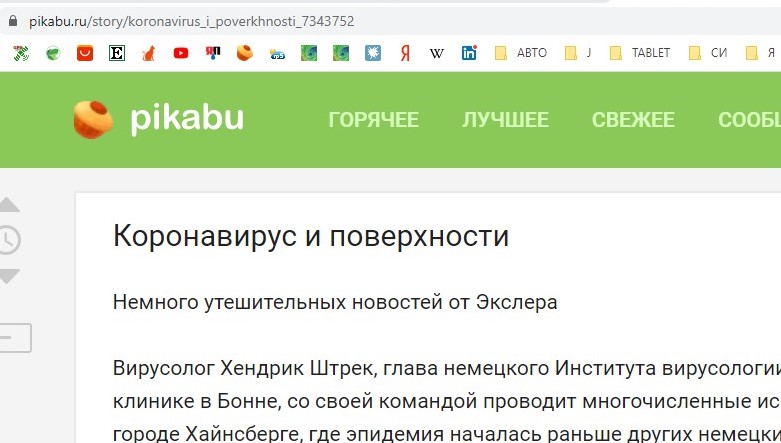 Вирусолог Хендрик Штрек, глава немецкого Института вирусологии при университетской клинике в Бонне, со своей командой проводит многочисленные исследования в немецком городе Хайнсберге, где эпидемия началась раньше других немецких городов. И они пришли к интересному выводу о том, что на поверхностях нет жизнеспособных коронавирусов - только нежизнеспособные. То есть вирусы там какое-то время сохраняются, но заразить никого не могут. Как Хендрик утверждает, даже в домах, где все были инфицированы, они не обнаружили ни одного жизнеспособного вируса на поверхностях.