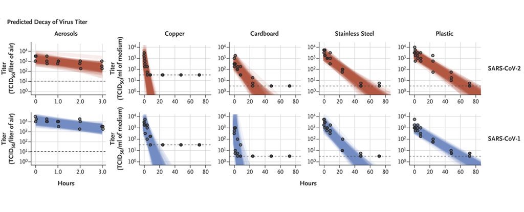Очевидно, какое-то время на поверхности вирус сохраняет жизнеспособность, но не такое большое, как думалось ранее на основании исследований по детекции вирусов на поверхностях.