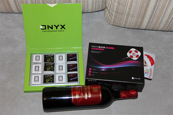 Ну и от компании "Макцентр" приехал целый джентльменский набор: прикольные конфетки, сделанные под модели ридеров Onyx, бутылка моего любимого испанского вина и новая модель ридера - Onyx Boox i62ML Aurora. Кстати, ридер интересный - экран Pearl HD, подсветка, мультитач, 8 Гб памяти. Скоро будет обзор.