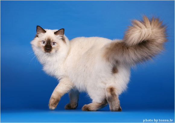 Порода называется "Невская маскарадная". Сибиряк, генетицки крашенный под сиамку. В итоге - роскошное сочетание галифе на задних лапах и голубых глаз.
