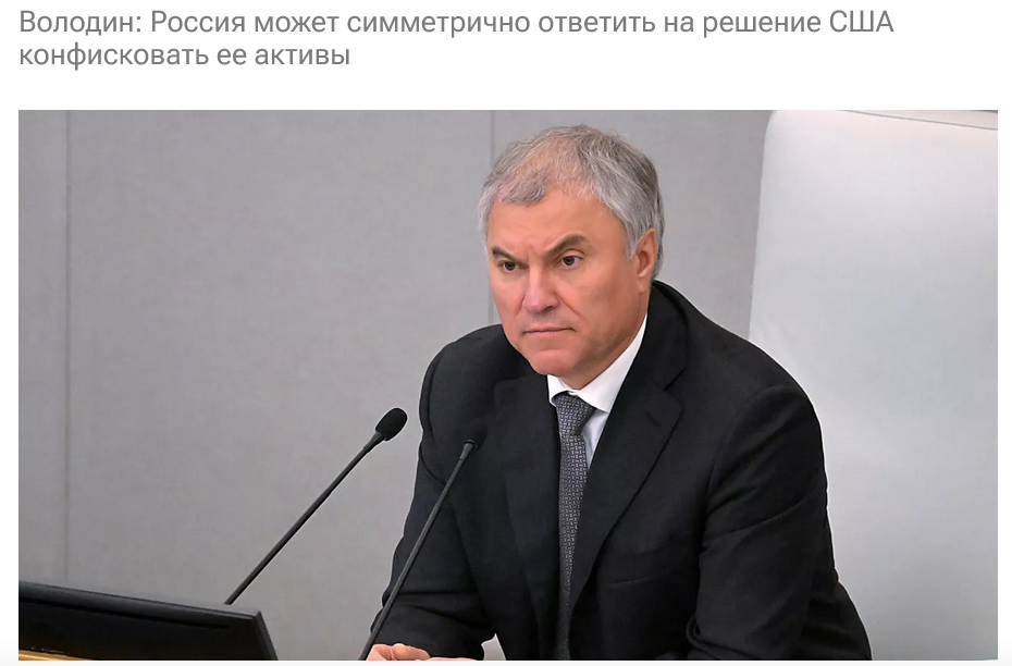 Тем временем в США приняли решение о конфискации замороженных российских активов в пользу Украины, которое очень не нравится кремлевским и они готовят "симметричный ответ",