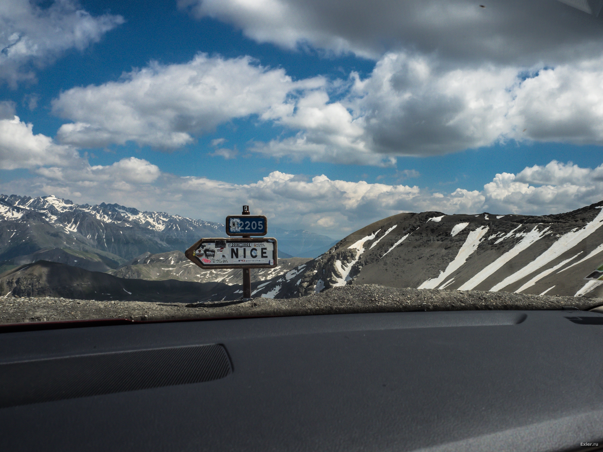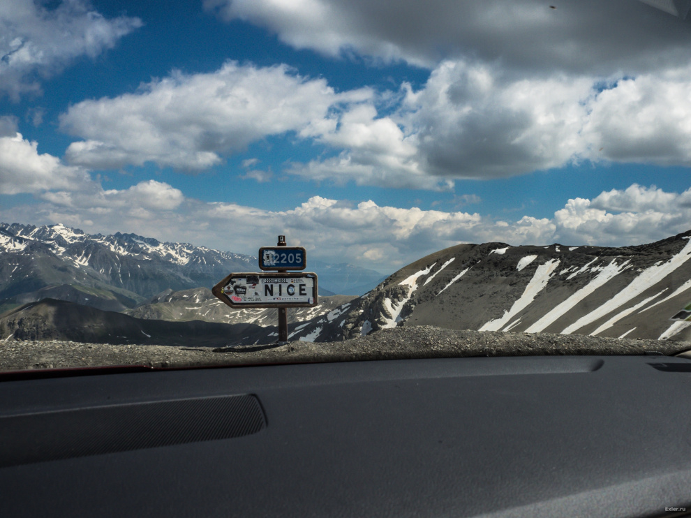 Вот вершина перевала - как раз указатель на Ниццу, после которого дорога идет вниз. Направо идет дорога на самую верхнюю точку, но ее завалило снегом, там было не пробраться. На перевале скопились мотоциклисты-велосипедисты, которые приехали сюда, чтобы покорить самую верхнюю точку, а тут - вот такой облом.