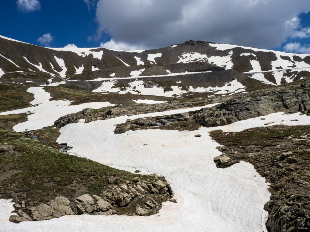 Вот тут уже едем среди заснеженных вершин. Хотя не сказать, что сильно холодно: я фотографировать так в рубашке и выходил. Ну да, слегка прохладно, но не мороз-мороз.