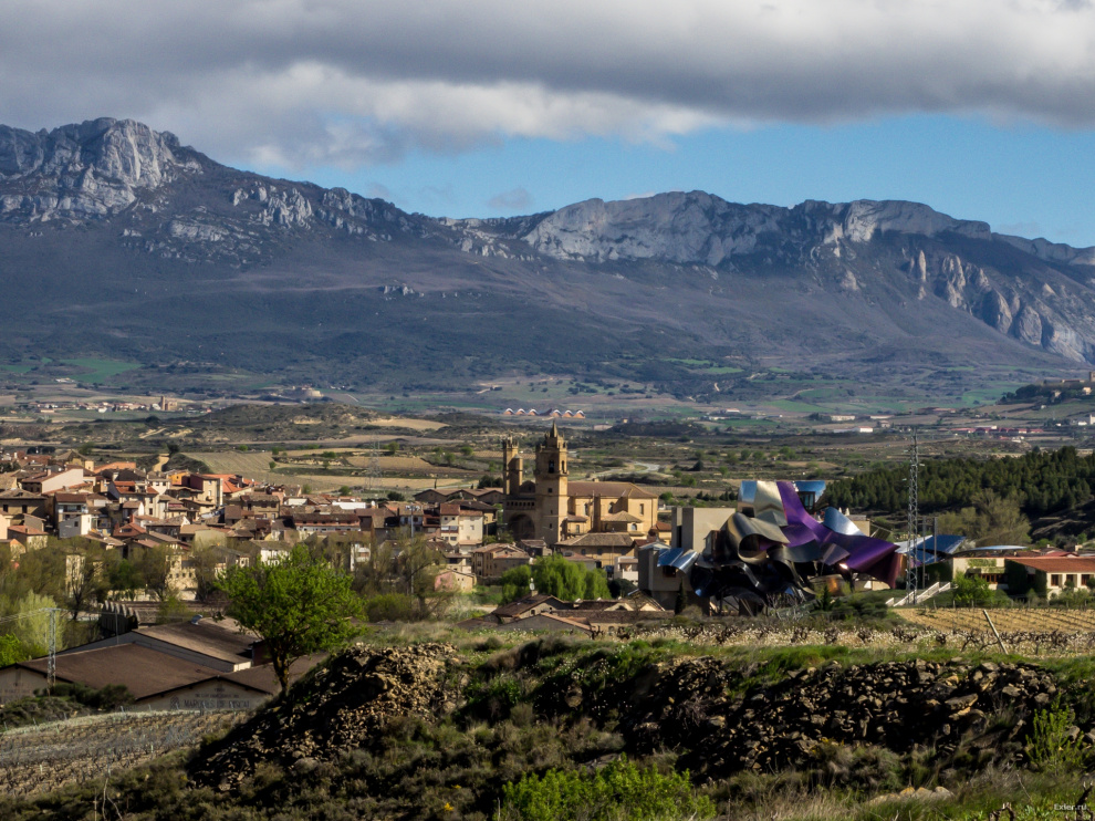 Справа от собора виднеется известный отель Marques de Riscal с футуристическим дизайном.