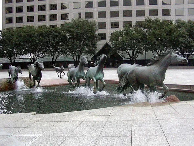 Лошадей в фонтане - это в Далласе, и дерево из руки - не помню где.