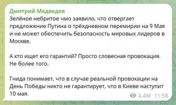 Ну и еще чисто поржать от страшно грозного Димона. Грит, если рискнут, то у Димона 10 мая может и не наступить. Так до 11 мая и будет дрыхнуть с бодунища.