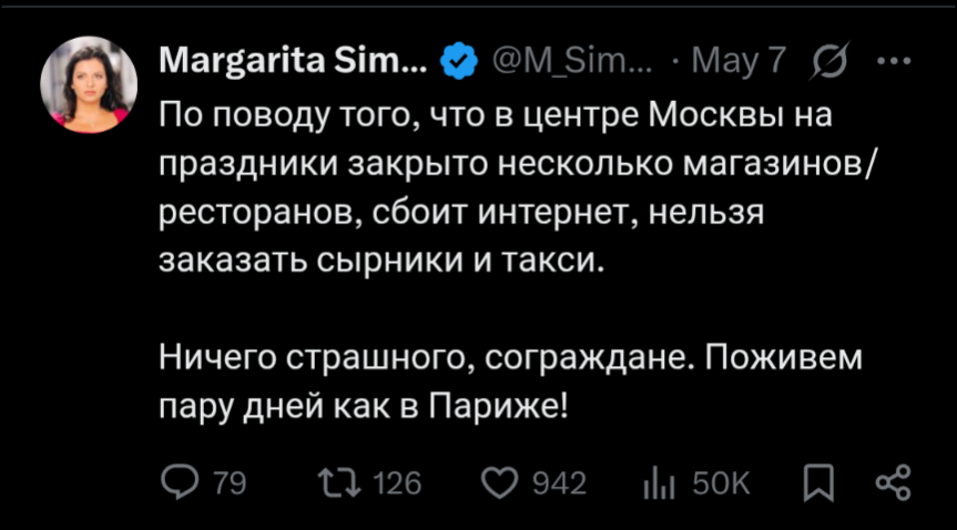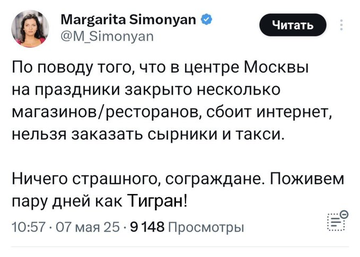 В Москве и Подмосковье с 5 мая происходят сбои в работе мобильных операторов. 7 мая на фоне генеральной репетиции парада на Красной площади в столице стали с перебоями работать платежные системы, приложения банков, служб такси и доставок. О трудностях в работе в ближайшие дни клиентов предупредили Сбербанк и ВТБ, оператор Системы быстрых платежей (СБП), Lamoda и «ВкусВилл», а Мосгортранс рекомендовал пассажирам общественного транспорта пополнить карту «Тройка» до наступления праздничных дней. На фоне массированных атак украинских беспилотников интернет также начали «глушить» в десятках городов и населенных пунктов России. По данным Baza, речь идет по меньшей мере о 30 городах и поселках в Ярославской, Тверской, Московской, Нижегородской, Тульской, Ленинградской, Калужской и Курской областях. (Отсюда.)