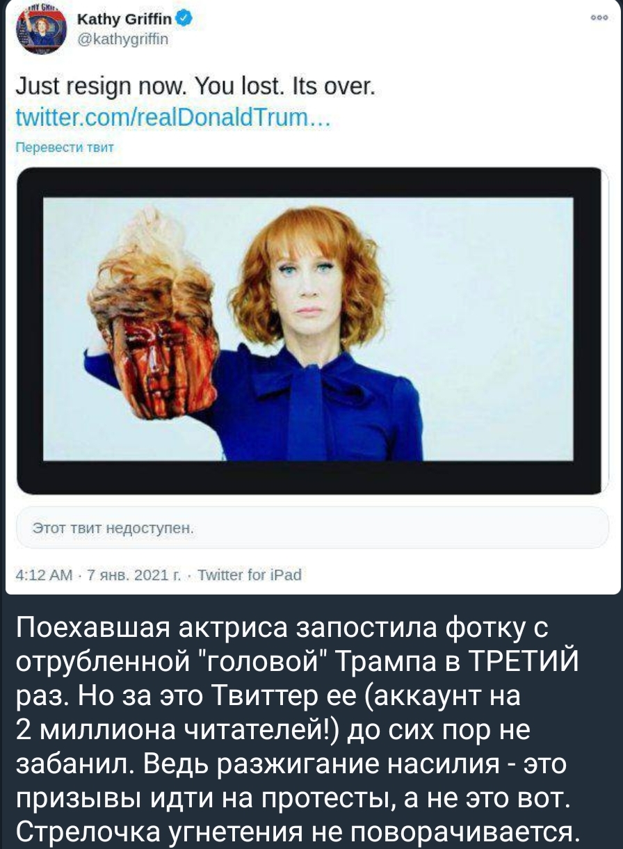 И где же "равнозначное отношение закона"? Трамп не стоял с чьей-то отрубленной головой - его забанили.