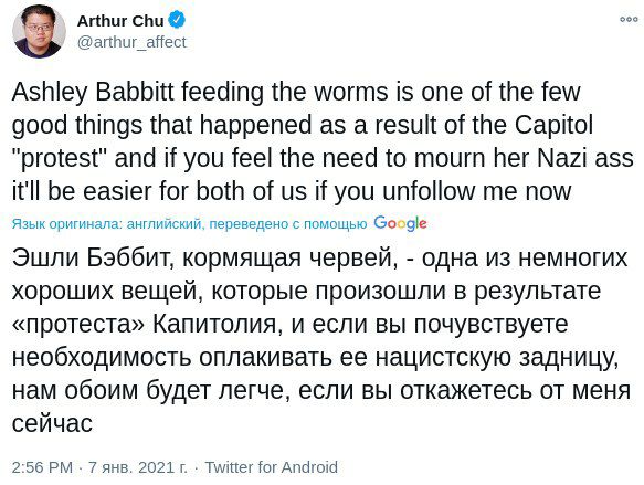 P.S. Нет, я, конечно, гневно и решительно осуждаю, "атака на демократию", "осада Капитолия", "хаос", "канистра с бензином", "государственный переворот", "фошизды конкретные", "волки позорные" и все такое. Весь полагающийся набор указал? Вроде весь.