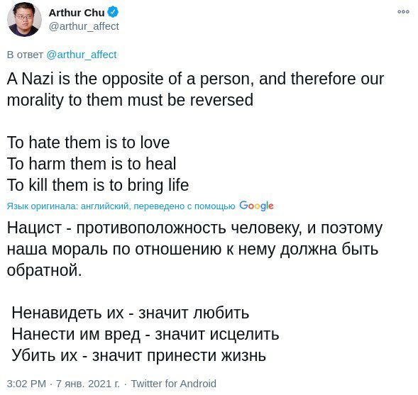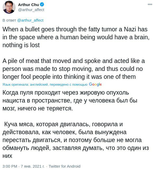 Человек показал "прекрасных людей на Парлере", я ему показал не менее "прекрасных" и, при этом, незабанненых людей на Твиттере.