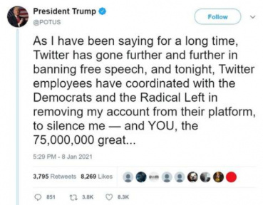 Прелестная история. Twitter, Facebook и еще несколько соцсетей навсегда заблокировали аккаунт Трампа, аккаунты "команды Трампа", аккаунты его группы поддержки, также аккаунты активно его поддерживающих популярных людей (например, Раша Лимбо, одного из самых популярных радиоведущих) и весь вчерашний день в ручном режиме следили за появлениями новых аккаунтов, где Трамп пытался обратиться к своей аудитории, и банили их тоже - "Trump Tweets From POTUS Account, Twitter Then Immediately Deletes It".