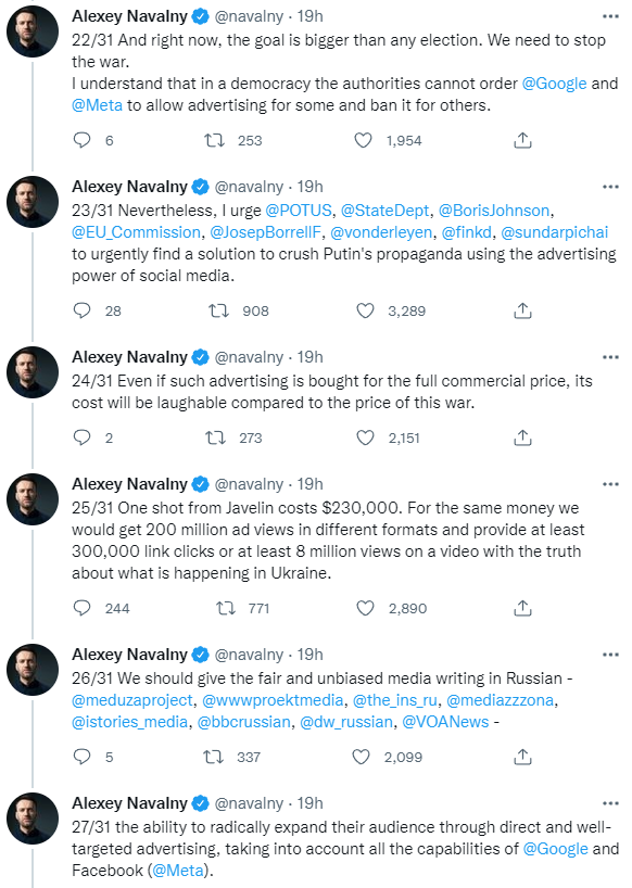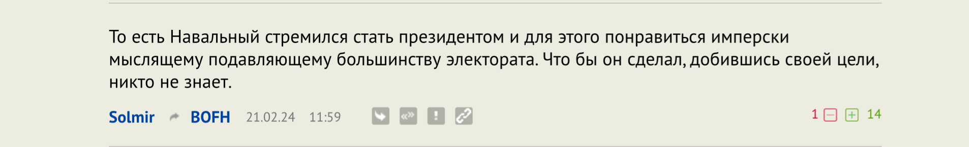 Я следил за деятельностью Навального с года 2014. Лично меня он разочаровал после его интервью с Гиркиным. Я все интервью смотрел. Смотрел с точки зрения жителя государства, в отношении которого гражданин Гиркин совершил агрессию (он не сам это делал, конечно и не по своей инициативе). Почти единственное что меня интересовало в этом интервью, участие Гиркина в войне. И меня поразило, что Навальный считает войну против Украины плохой не потому, что это подло и мерзко, а потому ... что это непозволительно дорого для России. Это была его аргументация почему эта война плохая. Других аргумнтов, кроме экономических, от Алексея не было! Следовательно, сделал я вывод, памятуя о его участии в "русском марше", о "хохлах, "грызунах" и т.д., если такую войну Навальный посчитает выгодной, он будет совсем не против. Конечно, мне могут возразить, что я сам придумал вывод. Да, сам. Именно так это виделось из страны, на которую напалп страна Навального и с учетом его бэкграунда.