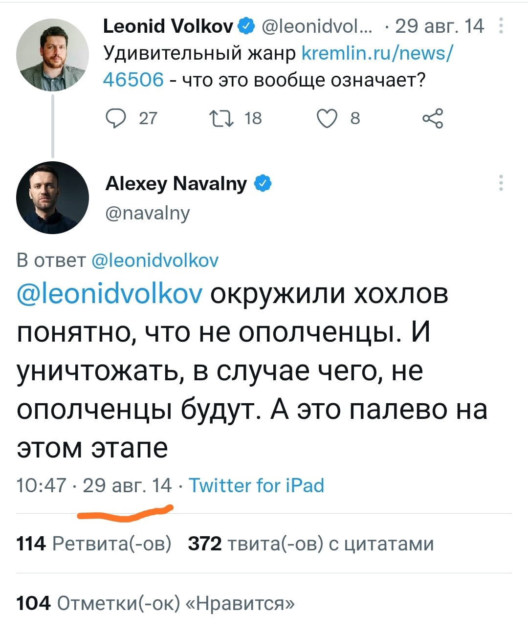 Уже позднее я узнал о твите Навального "окружили хохлов не ополченцы. В случае чего и уничтожать не они будут. А на данном этапе это палево" - если тут вырвано из контекста, то я представить не могу какой мог быть контекст чтобы можно было перевернуть впечатление от написанного.