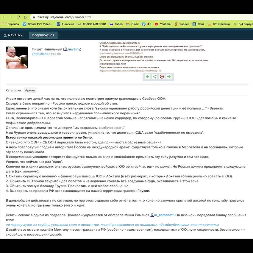 Ну да, очень жалел, что нельзя вдарить по штабу грызунов ракетой, призывал признать оккупированные территории, депортировать всех грузин и т.д. Через несколько лет извинился, конечно, но только за термин "грызуны". Все остальное как-бы считал правильным. Еще через десяток лет как-бы изменил позицию, но тут надо понимать, что сделал он это не потому, что считал свою предыдущую позицию ошибочной, а по причине того, что работая с европейцами и США, ища их поддержки, с надеждой когда-ть встать у руля в Кремле, просто нельзя было не озвучить мысль о территориальной целостности Грузии.
