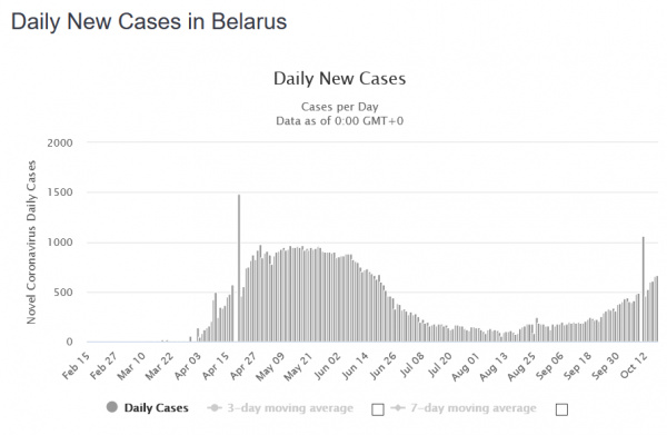 У нас (в Беларуси) подъем действительно есть. Я не про официальную статистику, а про обстановку "в реале" на примере маленького белорусского городка. Но отношение у людей более-менее спокойное, как и ко всякой заразе. Работать-то надо. И жить надо как человеки))) Запретительных мер нет, народ сам бережется. Появились опять люди в масках (это я не про ОМОН), в магазинах дистанцию держат. Вот и всё. У жены в коллективе 60 с чем-то человек, заболели 8, из них двое в больнице с пневмонией. Остальные на работе, только чаепития стали не такими массовыми))
