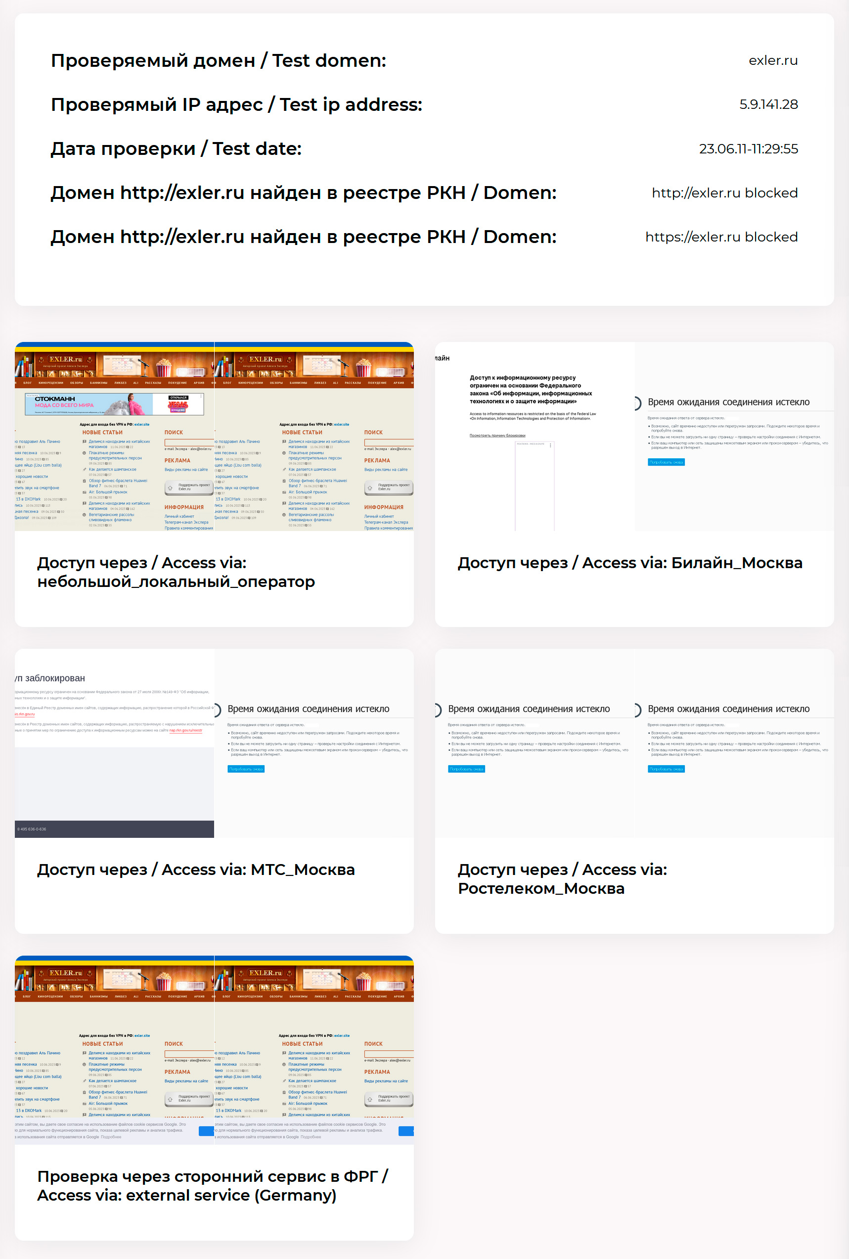 Проверяют и наличие блокировки как таковой, и доступность сайта из разных мест: локальный оператор, Билайн, МТС, Ростелеком, немецкий сервис.