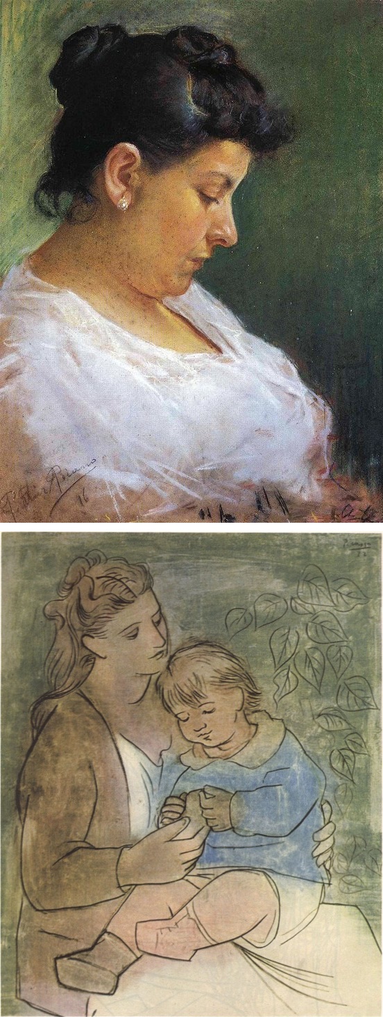 Чтоб не создавалось впечатление, будто Пикассо так рисовал, потому что по-другому не умел, не будет, наверное, лишним привести пару его других картин для сравнения: портрет мамы, который он в 15 лет нарисовал, и "Мать и дитя" 1922 г.