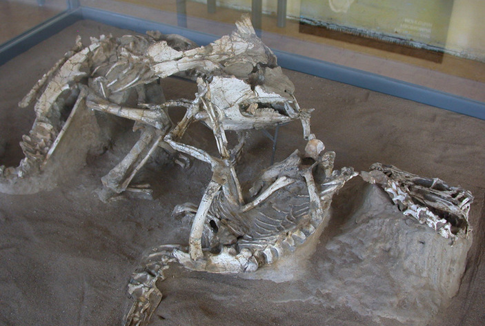 Мне напоминает знаменитую парочку, которая подралась 80 млн лет назад. Юный и вспыльчивый велоцираптор не сошёлся во взглядах с протоцератопсом, и тот его цапнул за переднюю лапу. Оба так увлеклись, что даже не пискнули, когда их сверху песком привалило, так до наших дней и простояли.