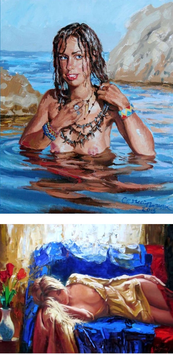 Поражает томная нега, которую излучают глаза лежащей обнажённой. Впрочем, глаза на поверку оказываются не менее выразительными грудями.