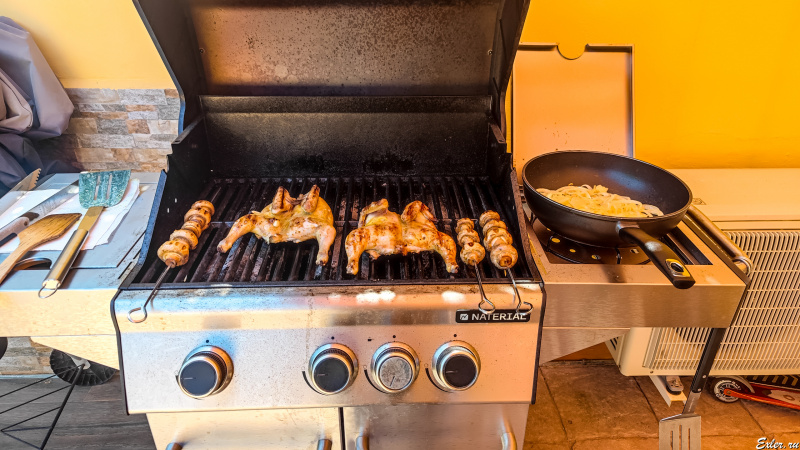 С цыплят будет капать жир, который может гореть на рассекателях гриля. В этом случае я просто двигаю цыпленка на решетке вперед или, соответственно, назад, и так ничего не пригорает.