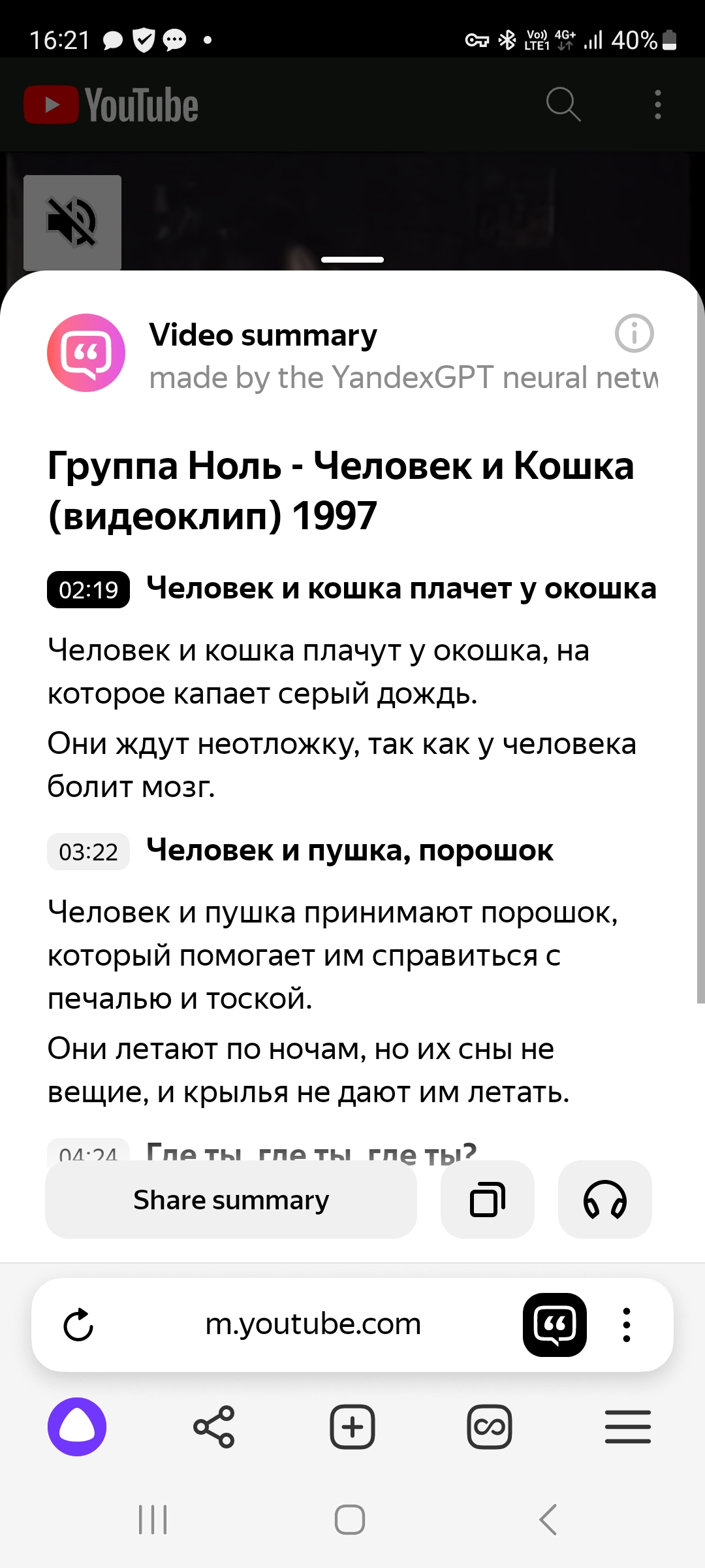 Так умеет делать Яндекс браузер. Но мне не особо нравится, как это работает. Потому что он очевидно не понимает суть. Какие то простые туториалы или рецепты ещё можно через него прогонять. А вот интервью уже нет. Но чтоб найти интересующий фрагмент или в принципе понять о чем речь — годится
