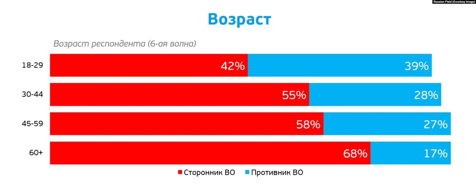По возрастам. Тут ожидаемо: чем старше, тем больше поддерживают войну. Цифры вообще достаточно страшные, конечно. Даже у молодняка, который первым погонят в Украину в качестве путинского пушечного мяса, уровень поддержки - более 40%. А у старшего поколения - и вовсе под 70%. Впрочем, оно и понятно, эти-то с утра до вечера смотрят говноТВ, где им Соловьев с Симонян свои помёты льют прямо в мозг.