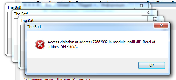 У меня во всех (оба двух версий) пятых The Bat! наблюдается одна и та же проблема. По несколько раз на дню вылезает или вот такое сообщение об ошибке в ntdll.dll, после чего программа впадает в ступор, ну или же она выкидывает несколько десятков сообщений Out of memory (это на 16-то гигах памяти), после чего впадает в клинч. Разработчики с этим пока ничего сделать не могут - я им писал, высылал логи.