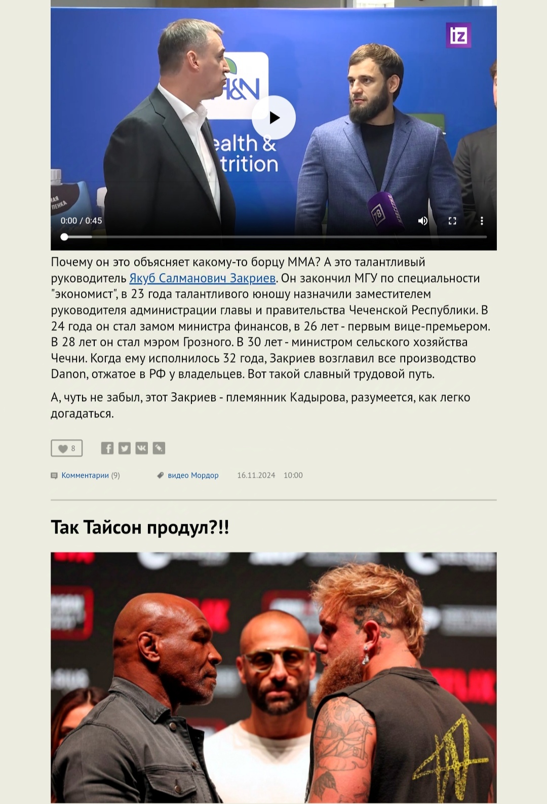 Почему он это объясняет какому-то борцу MMA? А это талантливый руководитель Якуб Салманович Закриев. Он закончил МГУ по специальности "экономист", в 23 года талантливого юношу назначили заместителем руководителя администрации главы и правительства Чеченской Республики. В 24 года он стал замом министра финансов, в 26 лет - первым вице-премьером. В 28 лет он стал мэром Грозного. В 30 лет - министром сельского хозяйства Чечни. Когда ему исполнилось 32 года, Закриев возглавил все производство Danone, отжатое в РФ у владельцев. Вот такой славный трудовой путь.