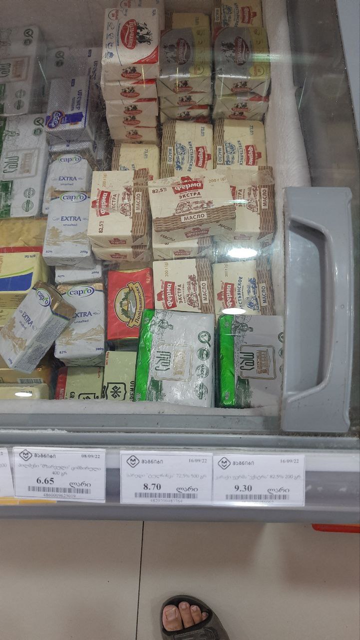 А еще у меня есть фотка из Грузии с ценой на масло с 22 года. Желающие могут пересчитать в свою валюту. Кстати, масло как раз родное украинское) та самая ферма/тульчинка, которую в Россию должны везти из ОАЭ)