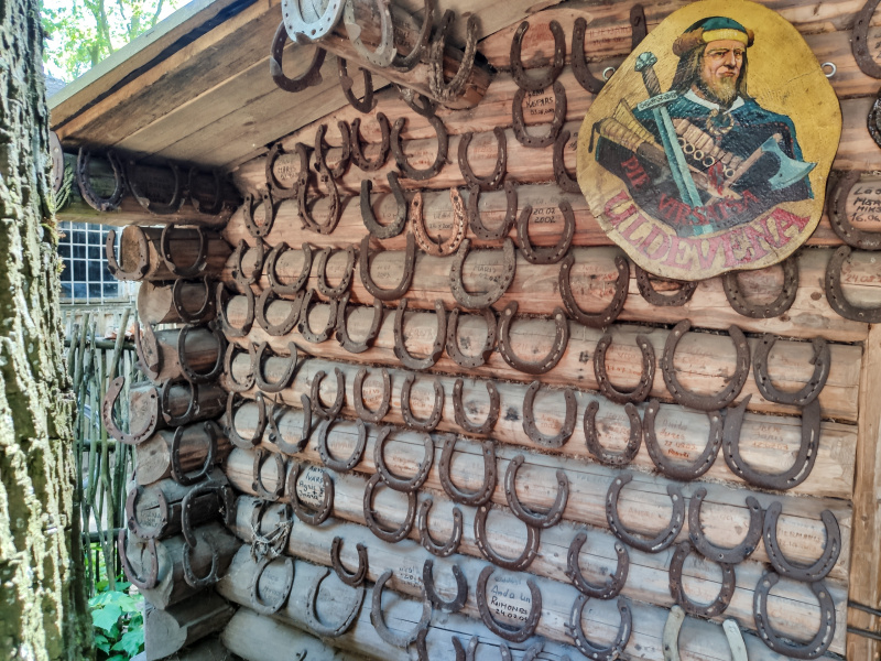 В замке проводятся свадьбы. Каждая пара прибивает подкову на эту стену.