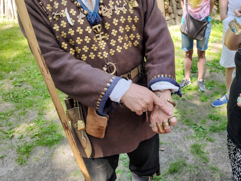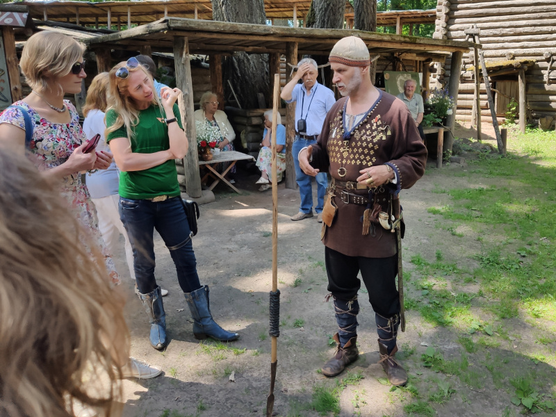 А это страшно прикольный дядечка, который водит экскурсии и рассказывает про быт древних латышей и о том, как они защищались от многочисленных врагов. В момент знакомства он спросил, откуда мы. Получил ответ: Таллин, Вильнюс, Москва, Питер, Киев, Барселона, Бремен, Женева, Страсбург, Будапешт. "Эк вас по свету-то разнесло", - сказал дяденька одобрительно.