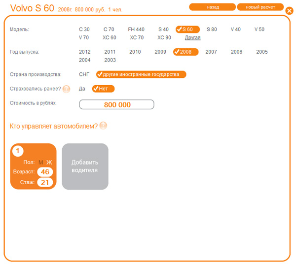 Выбираете, например, фирму "Согласие" (она дает клиентам сервиса 15% скидки), щелкаем по ссылке. После этого попадаем в раздел данной компании на сайте "Инсури", где содержится калькулятор КАСКО. Там надо выбрать марку машины, модель, задать год выпуска и нынешнюю стоимость машины.