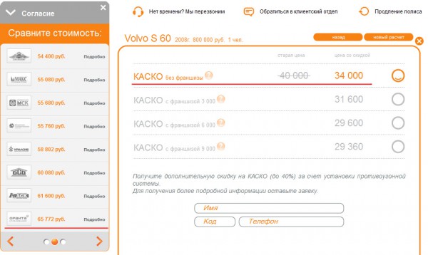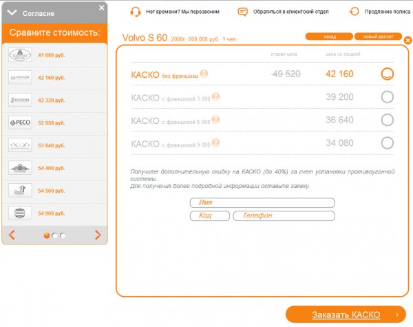 Далее, если вас устраивает выбранное предложение, то остается просто нажать кнопку "Заказать КАСКО", вписать свое имя и номер телефона - менеджер выбранной страховой компании перезвонит вам для оформления страховки.