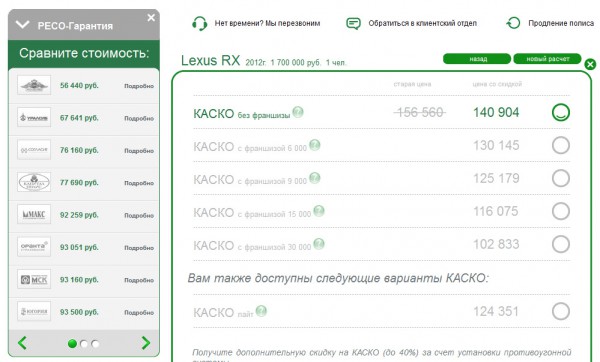 И вы не только получаете точный расчет КАСКО именно для данной компании, но и можете сравнить цены на КАСКО со всеми остальными компаниями-партнерами "Инсури" - данные приводятся в левом столбце.