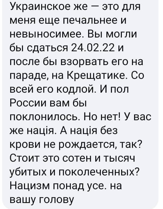 1. Считает украинский язык искусственно навязанным, бесперспективным и ненужным вообще, не только для русских. То же относится и к украинской культуре вообще.