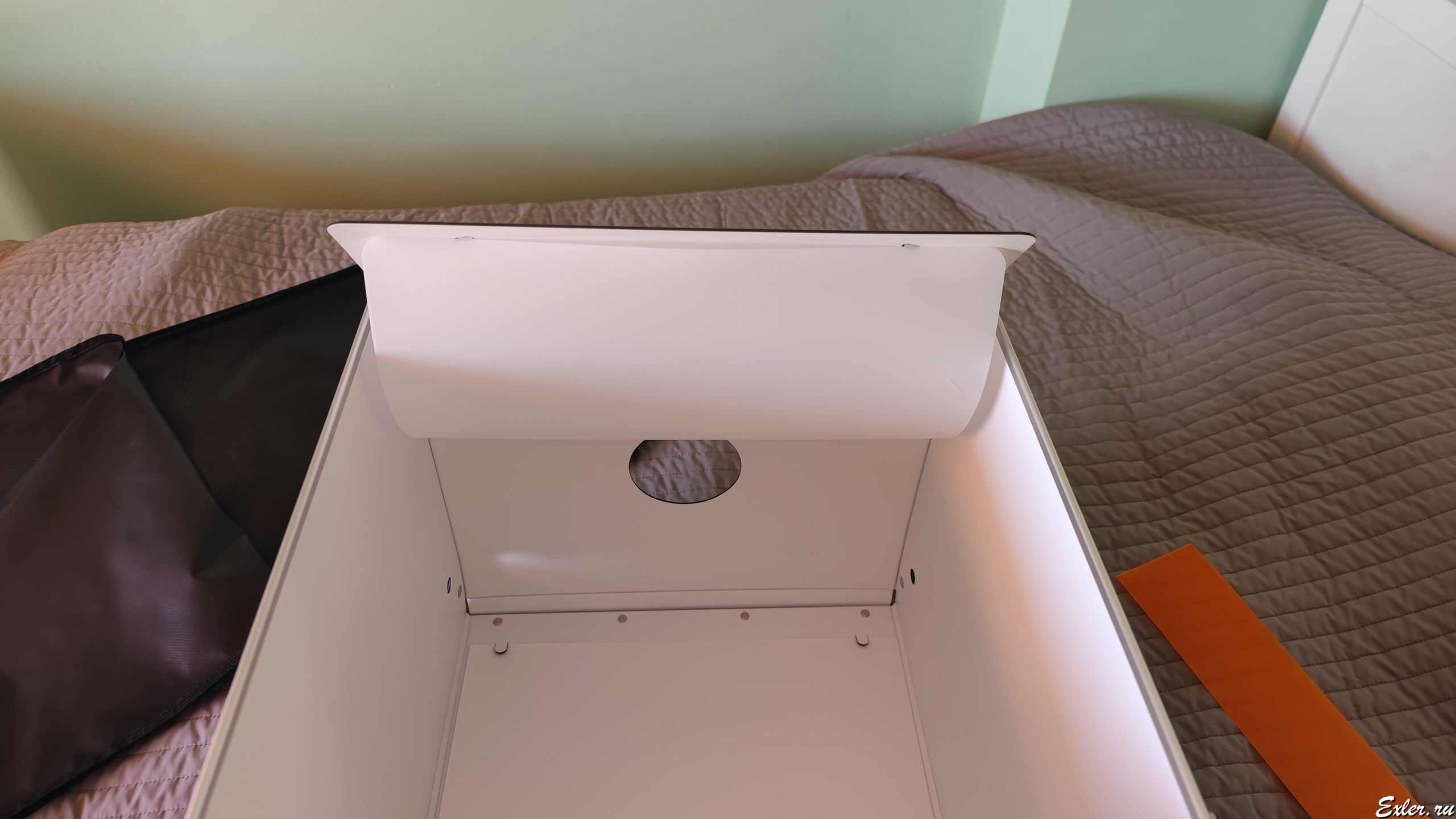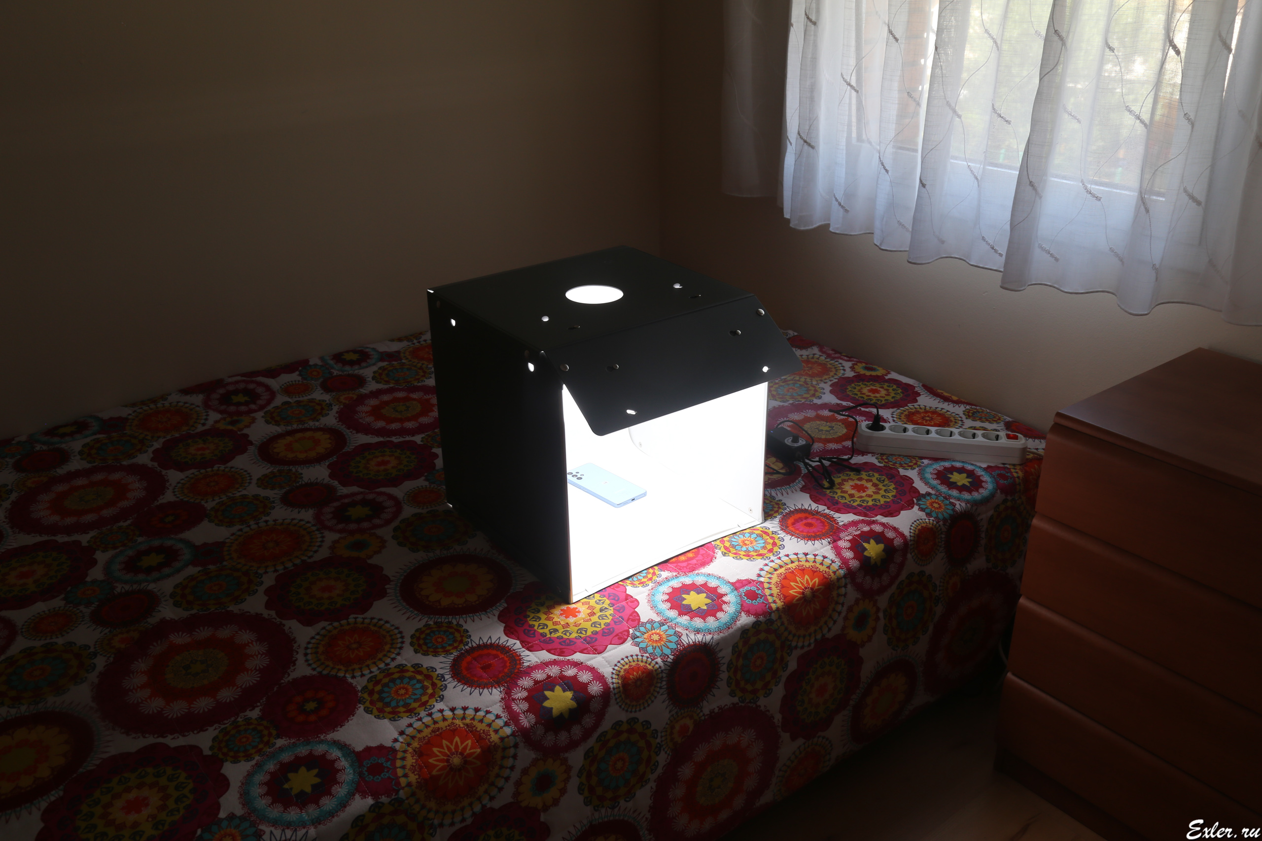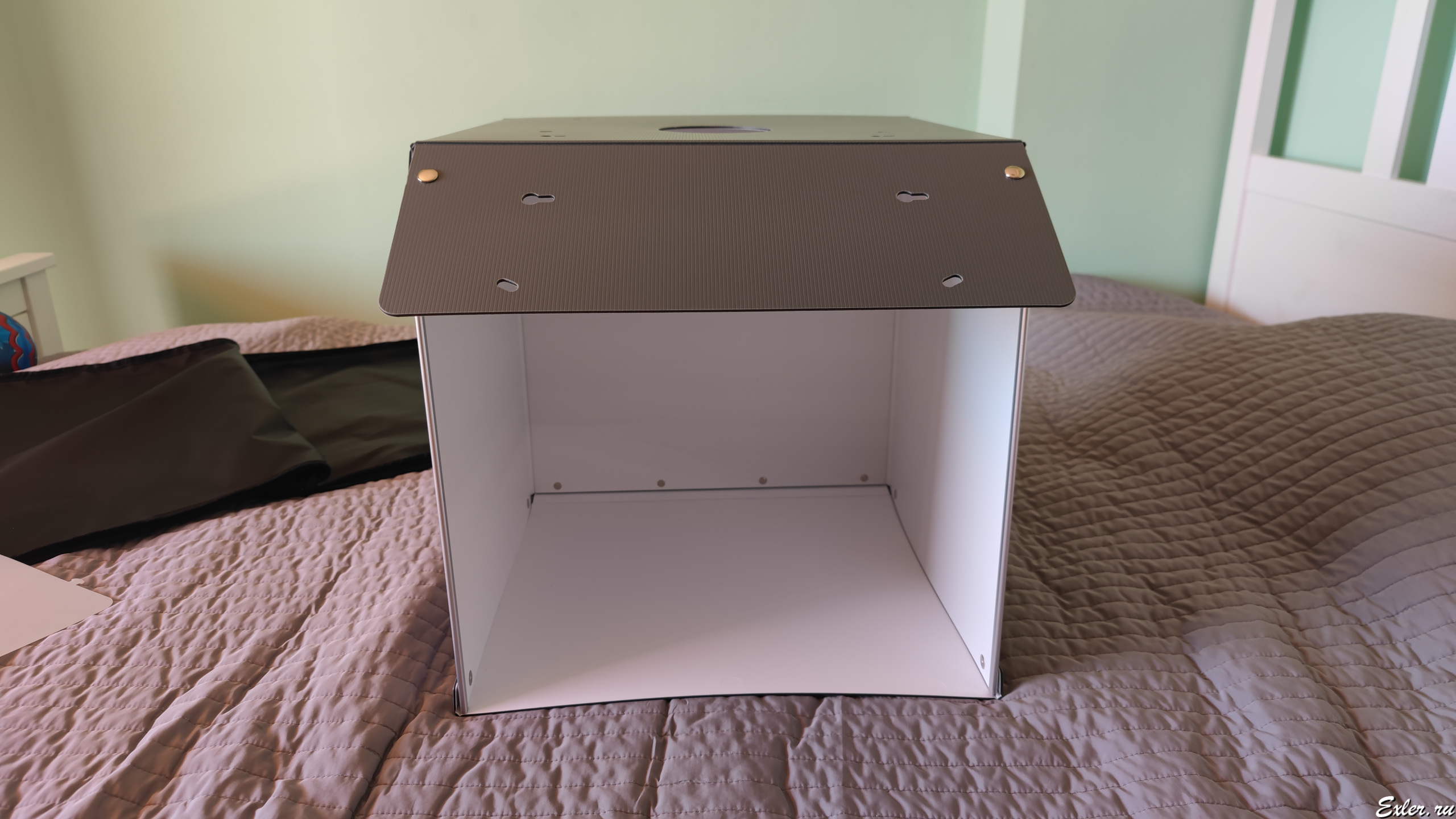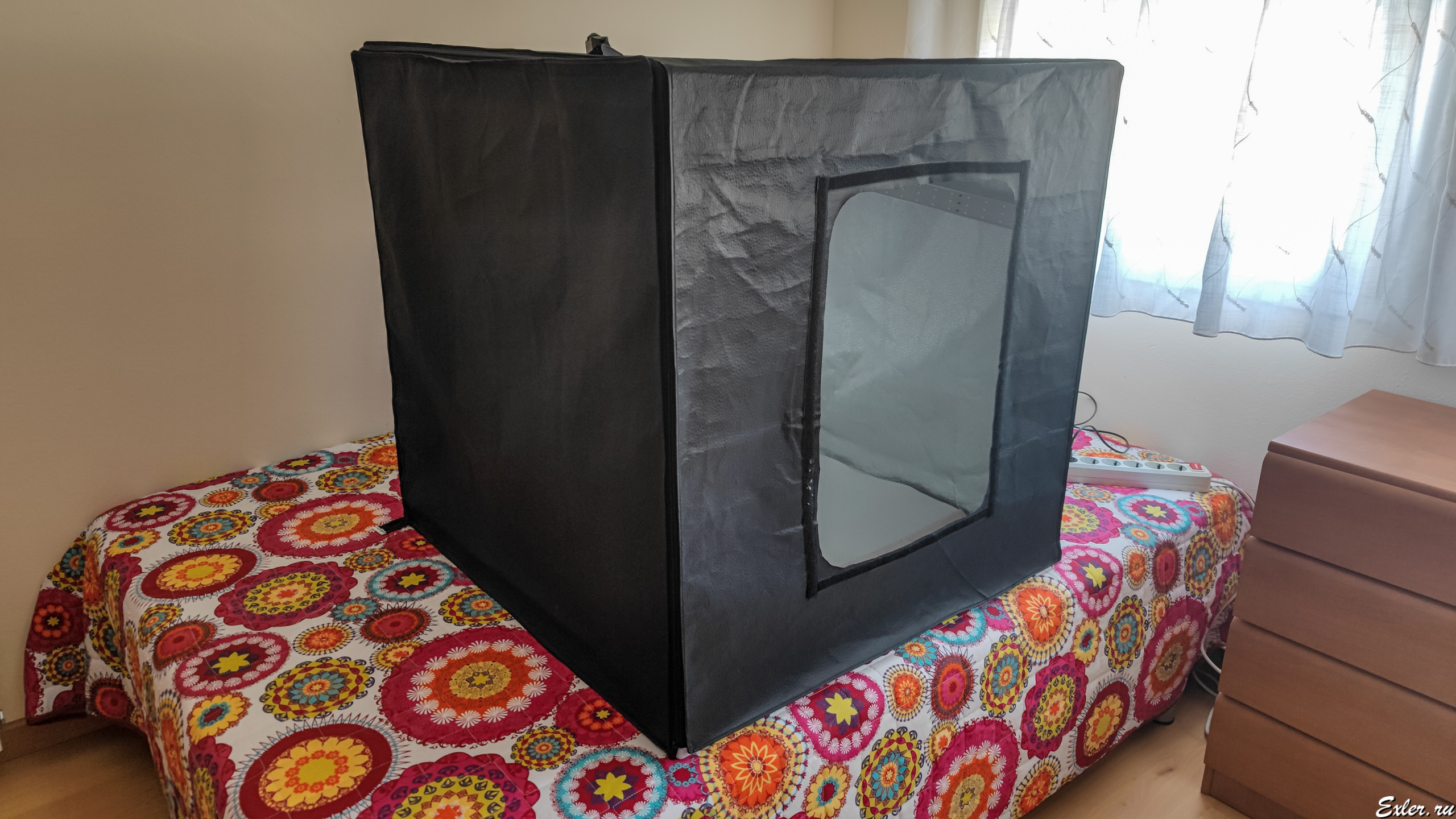 Не сказать, что он был очень удобный. Задник у него крепился на липучке и постоянно отваливался, крепление двух ламп было сделано совершенно безобразно, и лампы также постоянно слетали, рассеивателя для ламп не было, так что они бликовали на глянцевых гранях смартфонов, ну и плюс такой здоровенный куб - 80х80х80 сантиметров - для съемки всяких смартфонов-наушников был явно избыточен, тем более что, например, ноутбуки в нем уже нормально снять было нельзя. А тут белый задник у него окончательно пришел в негодность (загрязнился так, что уже не отчистить), новый задник к нему не купить, и я задумался над тем, чтобы взять себе другой лайтбокс - раза в два меньше и с более удачной конструкцией.