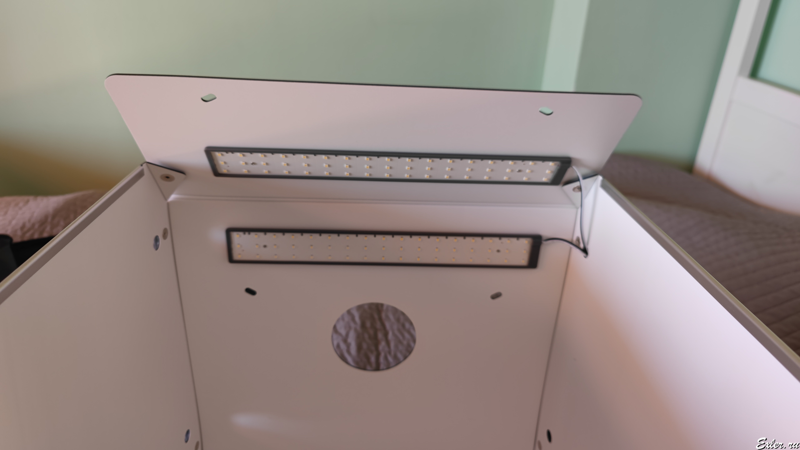 Можно снимать сверху, можно снимать с фронтальной части, вот этот загнутый козырек с лампой можно приподнимать, чтобы не мешал. Яркость ламп регулируется, также есть специальные вставки, меняющие световую температуру на более теплую, но мне это без надобности.