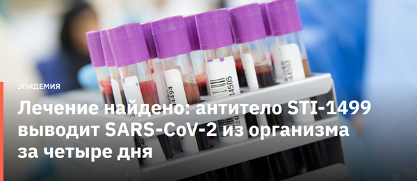 Прорывное заявление сделали ученые из калифорнийской биофармацевтической компании Sorrento Therapeutics. Они объявили, что антитело STI-1499 может на 100% подавлять SARS-CoV-2 и быстро выводить его из организма человека. По их мнению, это гарантированное лечение и оно может быть доступно намного быстрее, чем вакцина.