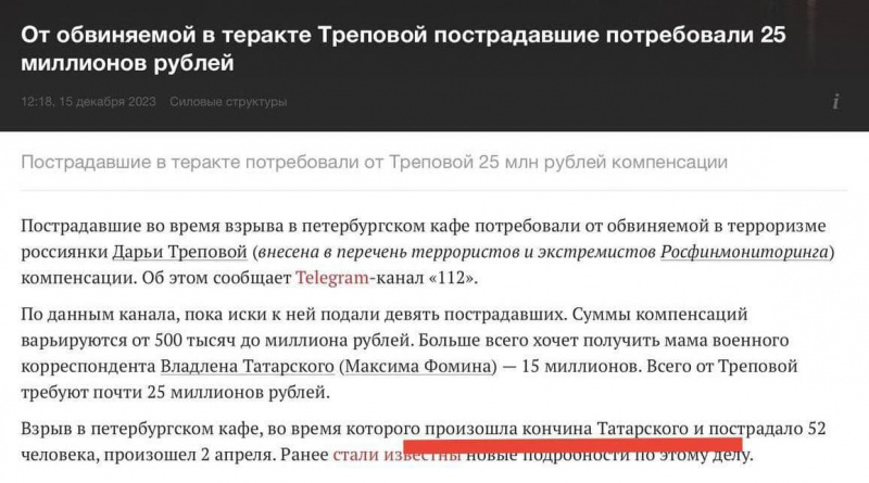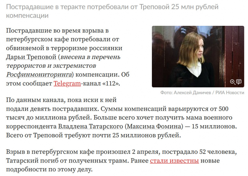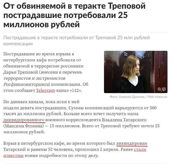 В Ленте.ру опубликовали заметку о том, что от обвиняемой в теракте Дарьи Треповой, которая принесла статуэтку на встречу с военкором Татарским, пострадавшие потребовали 25 миллионов рублей. В заметке на Ленте употребили термин "ликвидированный" по отношению к Татарскому.