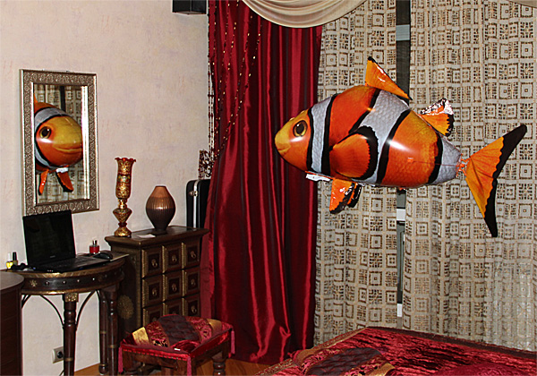 Все собрал, отцентровал рыбку, чтобы висела в середине комнаты, зарядил приемник, включил пульт управление на автомат и... полный класс, реально плавает по воздуху, как в ролике. Я думал, что китайский вариант будет какой-нибудь кособокий - нет, плавает как полагается, ребенок был в диком восторге.