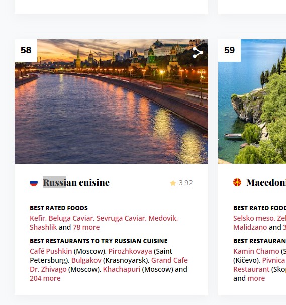 Ну а русская кухня недостойна и 58 места. Может, при Гиляровском она и была крутой, но её уничтожили при совке и заменили несъедобной совкожранью. Да при путинизме не айс - многие горе-рестораторы готовят из заморозки, миниатюрные порции и всё это по стокгольмским ценам, хороших ресторанов можно пересчитать по пальцам.