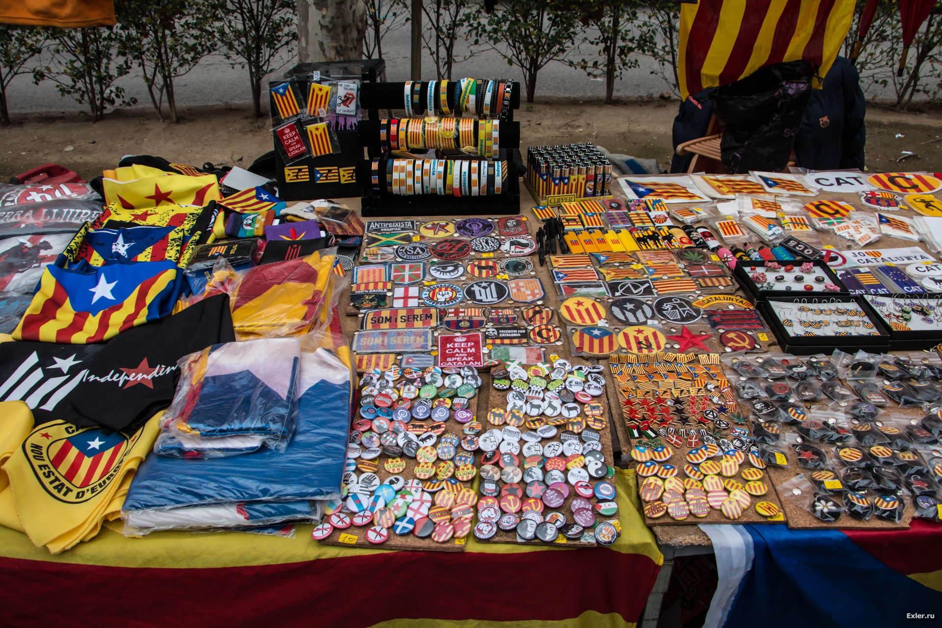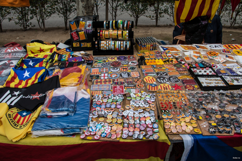 Это любимая тема в Каталонии, таких киосков полно на каждом шагу. Всевозможная каталанская символика с требованиями независимости, надписями (почему-то на английском) "Keep calm speak catalan" и так далее.