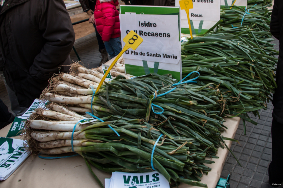 Парень экспериментировал с окучиванием лука-шалотa и в результате получил лук с длинной и вытянутой белой корневой частью. Что с ним делать - крестьянин не знал, но у него как раз жарилась баранина на решетке: он положил туда этот лук, пожарил его на огне, а потом попробовал съесть - и ему понравилось. После этого он подсадил на лук-кальсот свою деревню, затем город Valls, после чего эпидемия лука-кальсота охватила всю Каталонию - где-то лет за сто. (Я просто излагаю местную легенду, которая наверняка предельно неправдоподобна.)