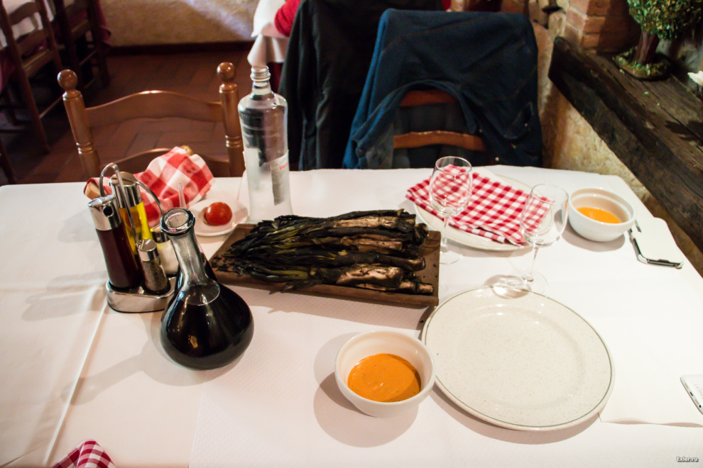 Теперь о том, что такое кальсотс (Calçots). Это блюдо, куда входит обжаренный на огне лук-кальсот (причем на человека - минимум десяток), обязательно соус ромеско (или аналогичный под названием "сальвитчада"), каталанский хлеб плюс к нему, как обычно, помидор и чеснок - делать каталанский хлеб для себя по вкусу. Кстати, почти всегда хлеб также поджаривают на гриле, но в этом ресторане такого не делали: надо на них настучать, чтобы отобрали лицензию за подобные вольности.