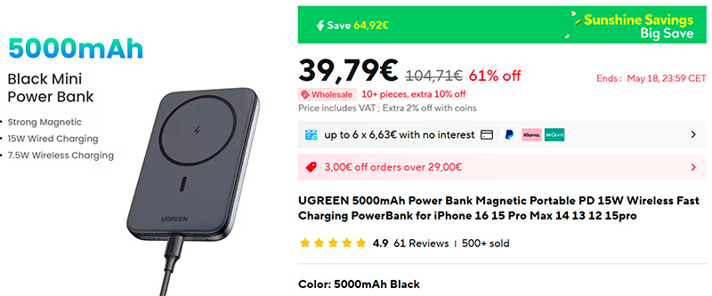 Они есть у Ugreen на 5000 и на 10000 мАч с поддержкой мощности 15 Вт (есть и на 35 Вт, но дороже).