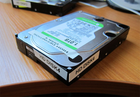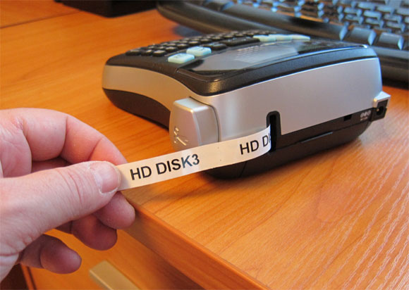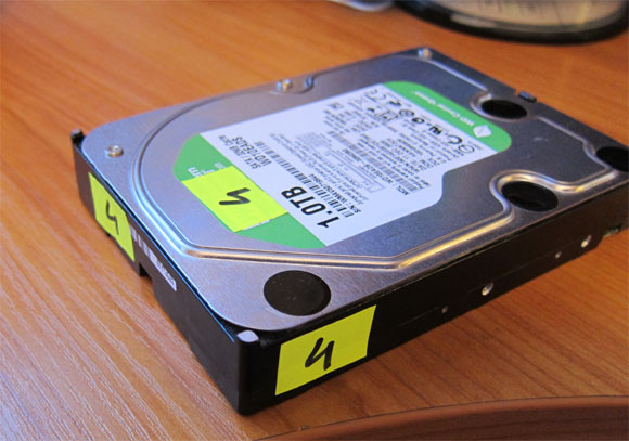 Я, собственно, для чего это все использовал? У меня же теперь киноколлекция на винтах, коих семь штук плюс они все прибавляются. Винты я раньше обозначал, рисуя фломастером на обычных желтых наклеечках кривые цифры. Выглядело это довольно своеобразно, вот так.