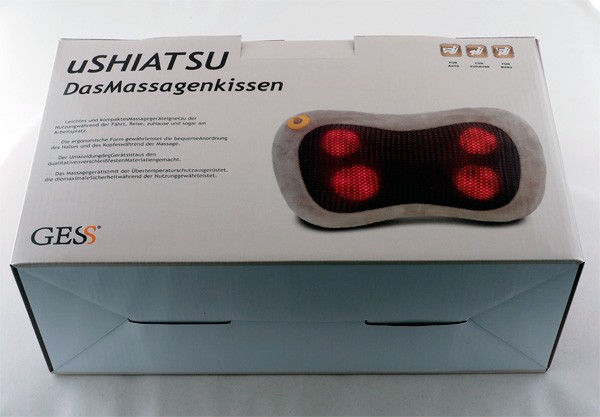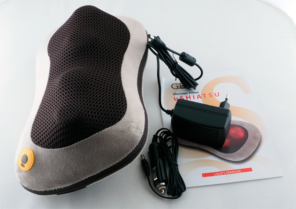 Комплектация: подушка-массажер, адаптер питания для обычной розетки, адаптер для автомобиля, инструкция.
