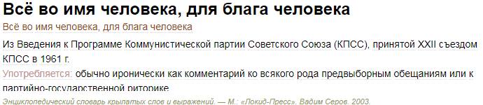 Мне показалось, что вы посчитали мою цитату неточной и привели аргумент из Программы КПСС. А на самом деле ничего неточного нет, лозунг существовал и в том виде и в этом. В том виде, что привёл я, он был на плакатах, на зданиях, монументах и т.д.