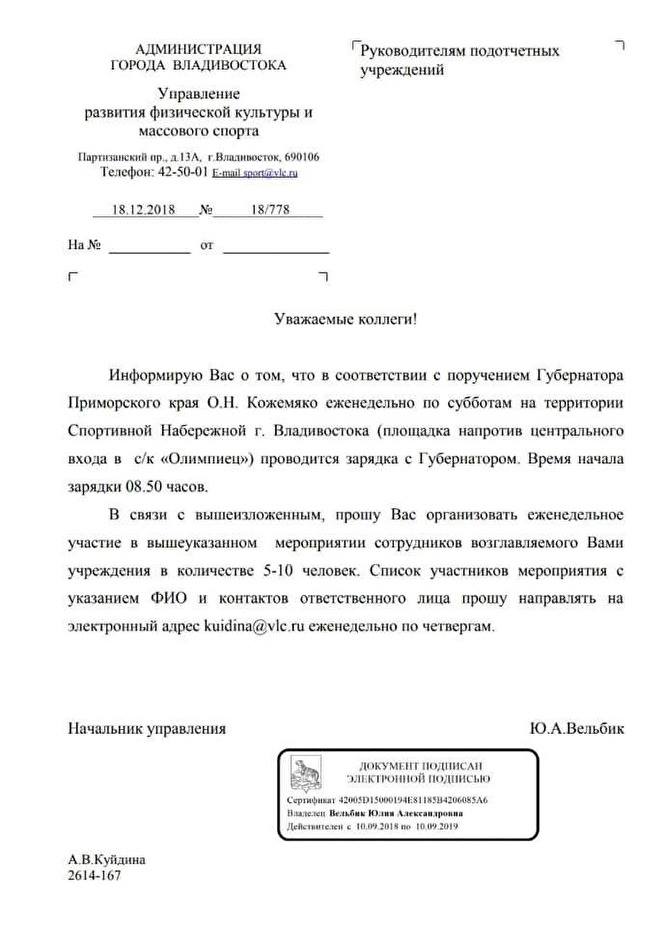 В очередной раз убеждаюсь в том, что в России нынче бюджетники - те же крепостные. Любой начальственный дебил по своему желанию может заставить их делать, что угодно. Сначала их начали заставлять голосовать за известно кого и в нарушение Конституции (это, кстати, конкретная уголовка) приносить доказательства, что они проголосовали именно за Пу, а не за кого-то еще. Теперь их в собственный выходной выгоняют бегать. Видите ли, зарядка с губернатором.
