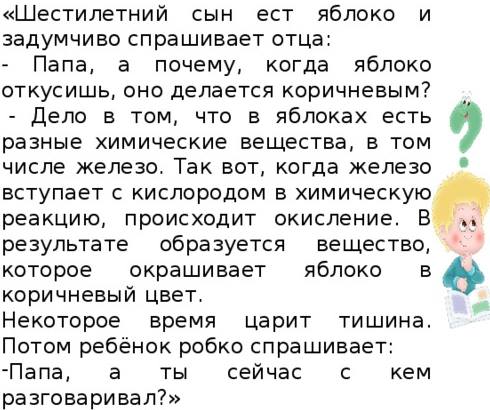 - Папа, а ты с кем сейчас разговаривал? Это неправильное объяснение, насколько я знаю. Яблоко становится коричневым из-за окисления фермента полифенилоксидазы с кислородом воздуха, что приводит к образованию бурых пигментов, таких как меланин.